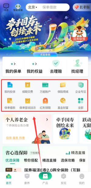 4、該頁(yè)面同時(shí)整合了新增投保辦理、續(xù)期保費(fèi)繳納、萬(wàn)能賬戶管理、保險(xiǎn)產(chǎn)品商城、保單質(zhì)押借款及基金理財(cái)產(chǎn)品入口。